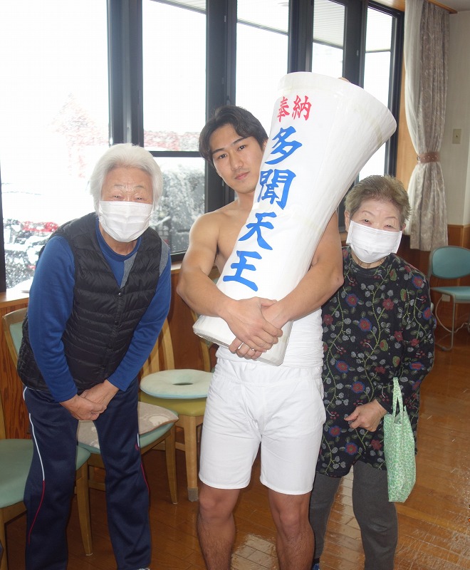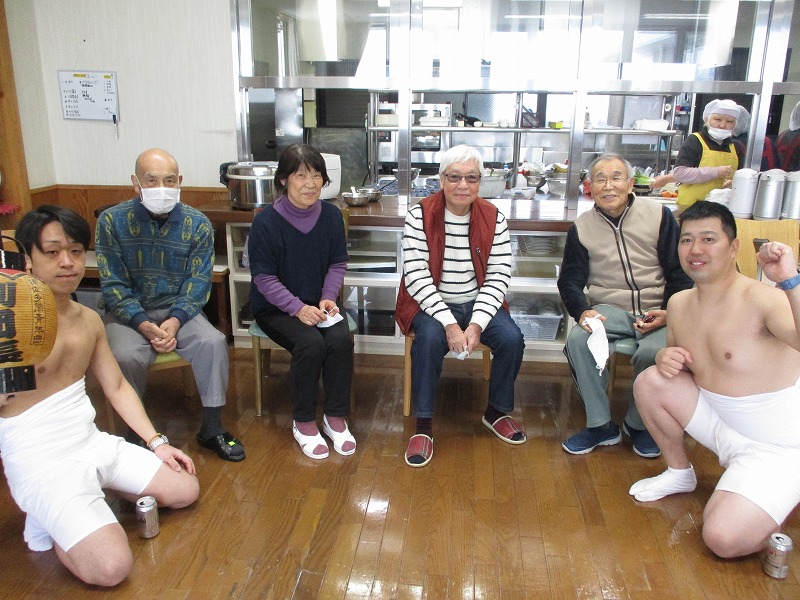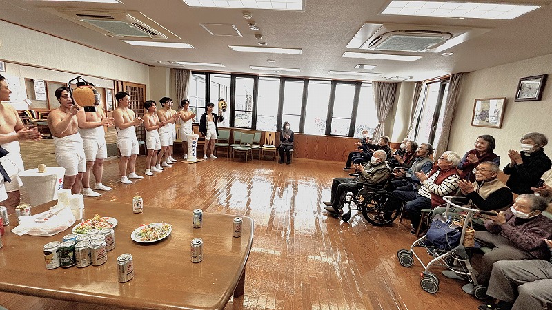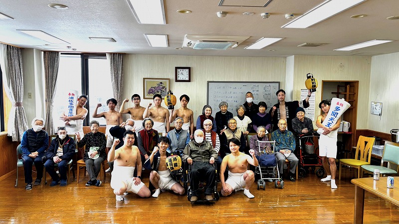 ケアハウス鈴懸職員冨永夏実 2月9日(土)に多門青年団員が昨年に引き続きケアハウス鈴懸に表敬訪問に来てくれました。今年は最高幹部含め10名の方が来てくださいました。入居者とお話ししたり記念撮影を行なったりとコミュニケーションをとりながら、最後は集合写真を撮り、「さんよ節」を歌ってお別れしました。