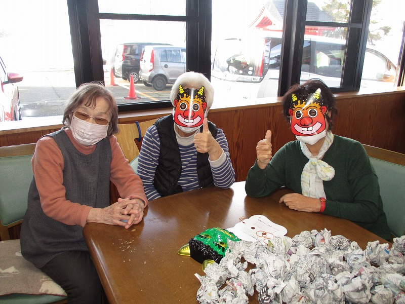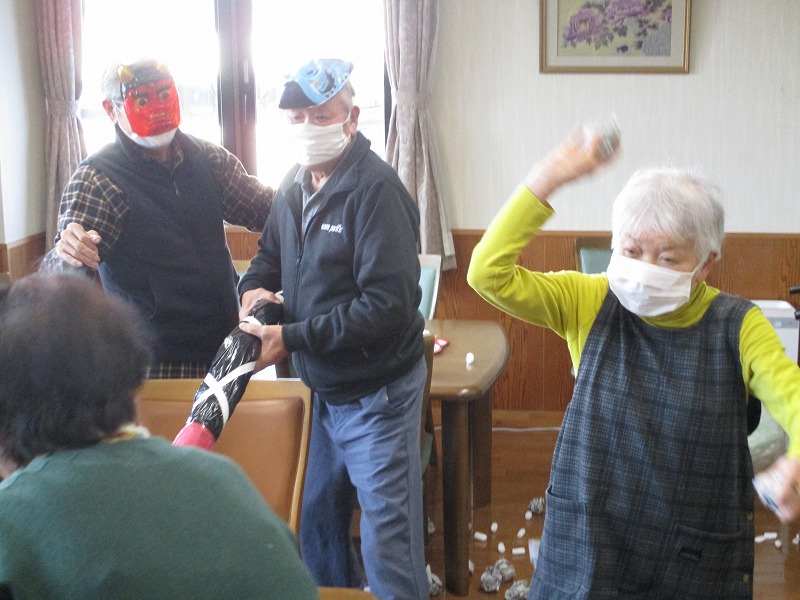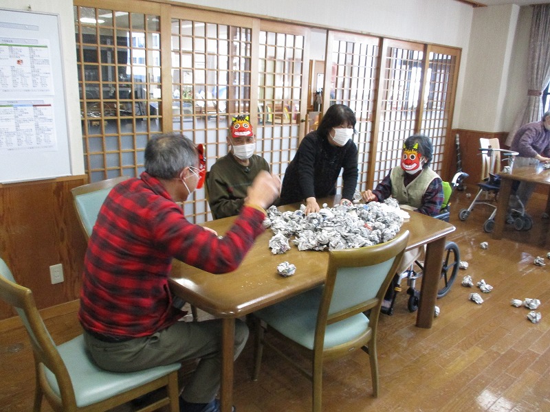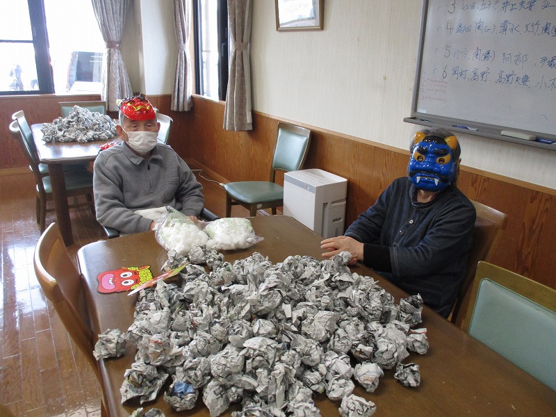 今年も新聞紙をゴルフボール程度の大きさに丸めて鬼になった職員にぶつけて楽しみました。